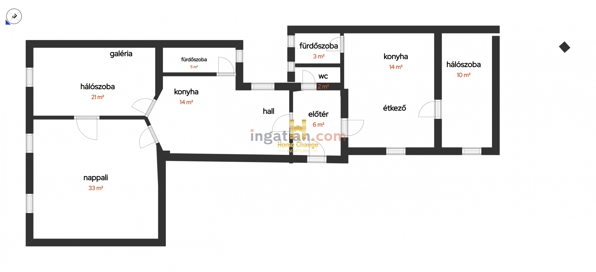 A nagyobbik lakrész ca. 70 nm, a kisebbik lakrész 33 nm, így akár két generációnak vagy vállalkozásnak, irodának is kitűnő választás lehet.